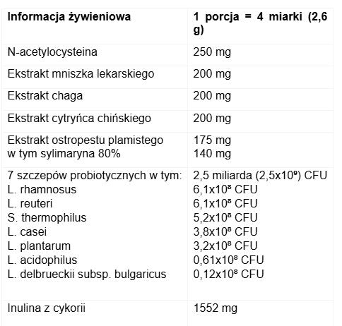 inulina z cykorii, N-acetylocysteina, ekstrakt z korzenia mniszka pospolitego (Taraxacum officinale F.H.Wigg), ekstrakt z owocników chaga (błyskoporek podkorowy, Inonotus obliquus), ekstrakt z owoców cytryńca chińskiego (Schisandra chinensis (Turcz.) Baill); ekstrakt z nasion ostropestu plamistego (Silybum marianum (L.), liofilizat kultur bakterii (L. rhamnosus, L. reuteri, S. thermophilus, L. casei, L. plantarum, L. acidophilus, L. delbrueckii subsp. bulgaricus) - zawiera mleko; glikozydy stewiolowe ze stewii - substancja słodząca. Możliwe śladowe ilości sezamu, jaj, soi, orzechów, orzeszków ziemnych, zbóż zawierających gluten, ryb, skorupiaków, mięczaków.